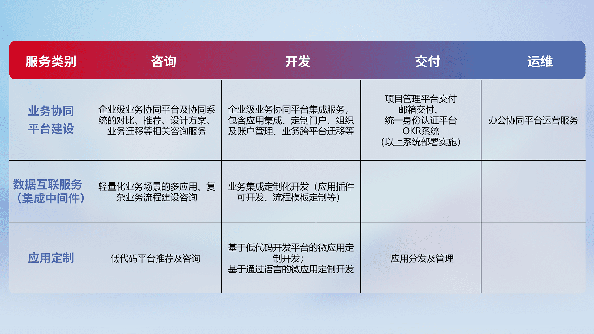 针对钉钉、、、、企微、、IDaas等平台级产品提供产品的规划、、、、方案、、、、交付、、、定制化开发等服务,,实现如统一协同办公、、、智能客户服务、、、混合会议管理、、、、智能数据查询、、等业务场景,,,,实现数字化转型。。。。